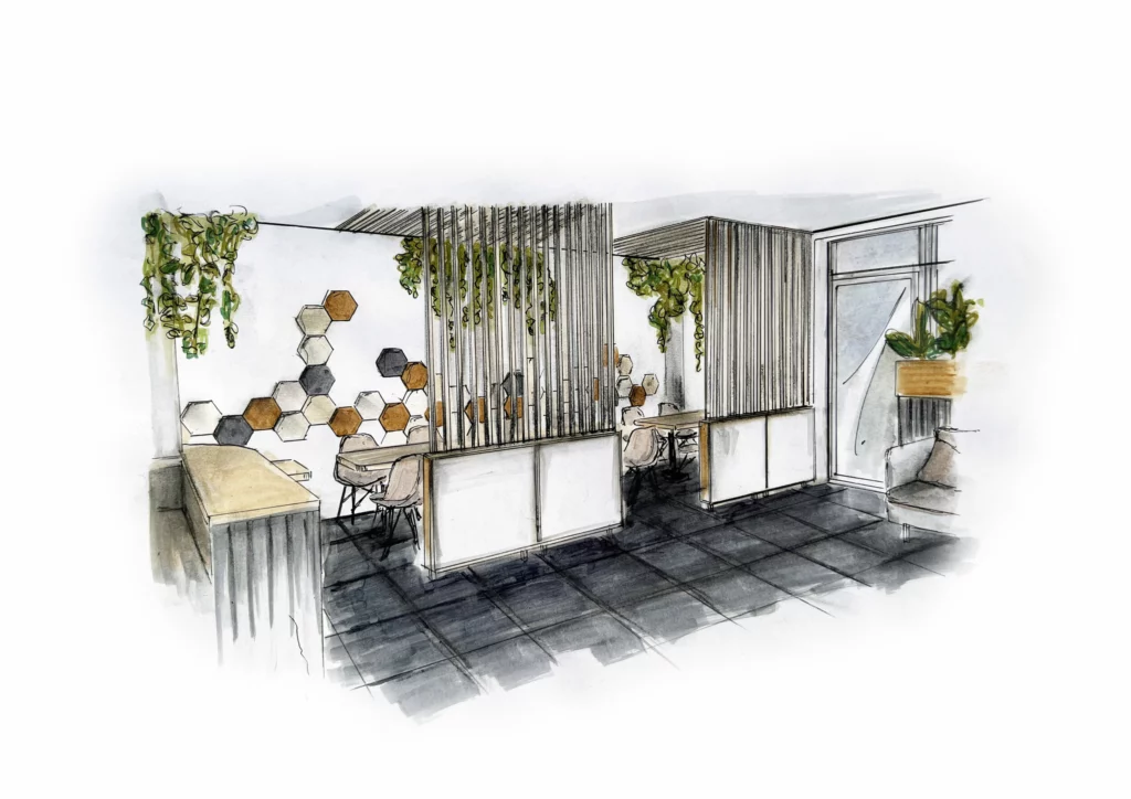 D’un côté, une zone d’attente avec une ambiance industrielle et végétale. Elle invite à patienter dans un cadre moderne et naturel. De l’autre, une zone de restauration, pensée comme un cocon végétal, où chaque détail crée une atmosphère chaleureuse et intime.