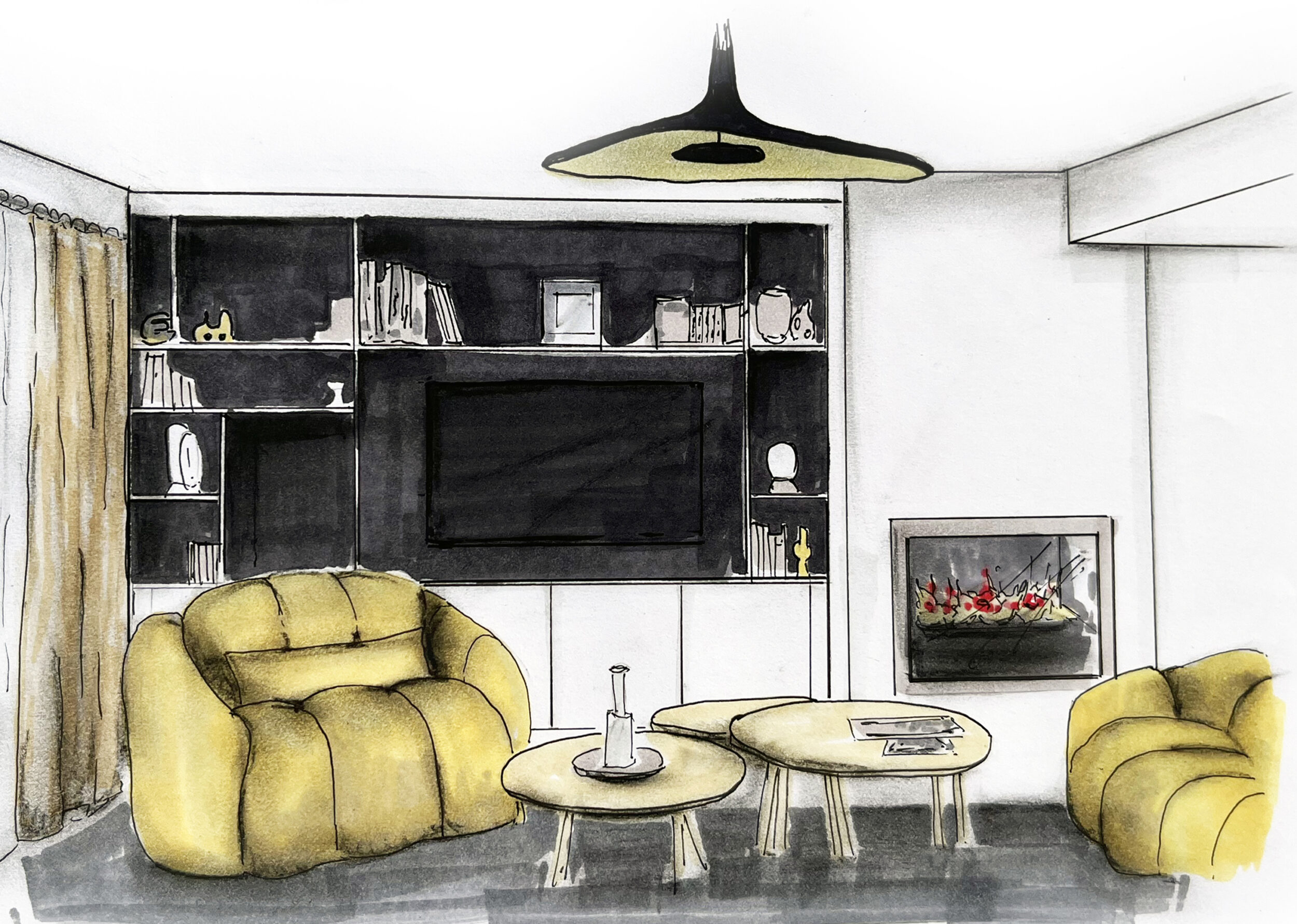 Dans cette nouvelle construction, le séjour, bien que spacieux et offrant des dimensions généreuses, présentait un défi : son ampleur semblait désorienter mes clients, rendant difficile l’ajout de chaleur et de convivialité. L’enjeu était de créer une atmosphère accueillante tout en exploitant l’espace sans perdre en confort.